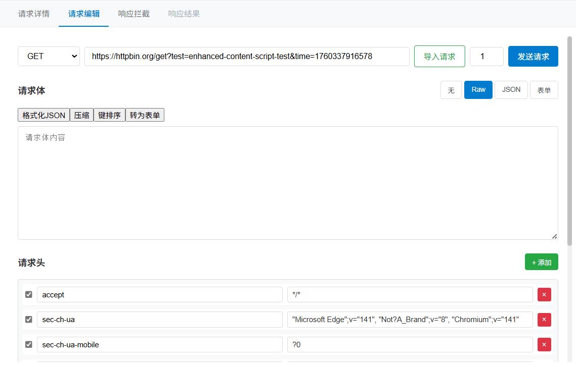 可以对选择的请求进行编辑,包括URL、方法、头部和体内容,然后重新发送修改后的请求, 获得新的响应数据。